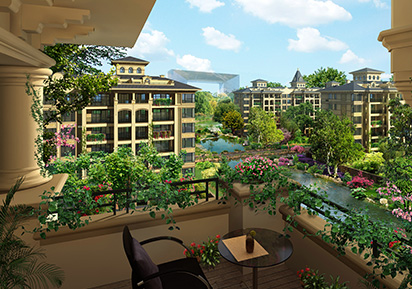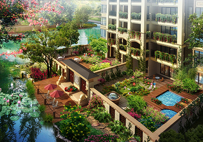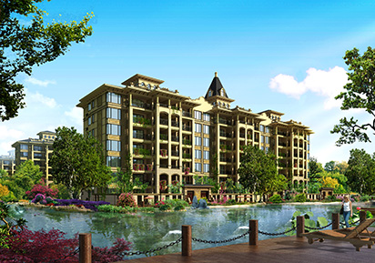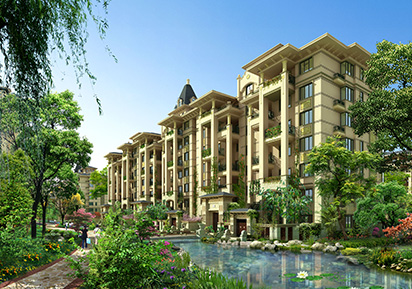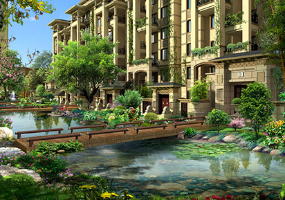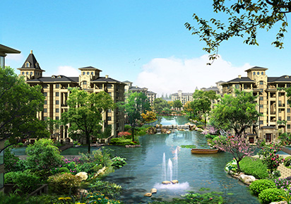 如水上公園中精心點(diǎn)綴宜居洋房,在公園里生活居住,